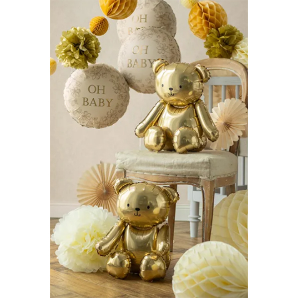 Add a touch of charm with this gold-colored sitting bear foil balloon. Its dimensions are approximately 43 × 53 cm (17 × 21 in) before inflation and 38 × 42 cm (15 × 16.5 in) after inflation. Designed for air inflation, the set includes a straw for easy setup. Perfect for baby showers, Valentine’s Day, or as a cute decorative accent.